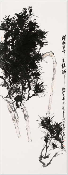 观其画作,磊落宏阔,一个纯粹的艺术情境。顽石撑起天地,枝干翔于玉宇,开花似有千年,结果恍同隔世。一枝一叶,皆凌空而舞,梢头迎天风。一笔一画,都清澈明朗,顿挫凝深情。箫鼓已动,渴骥奔泉,浓墨映异彩。铁琴轻抚,柔痕欲断,细线见清空。空白处若天马离岸,风云飘举。积墨处似掷地黄金,厚重自持。笔墨拆解,眼光于画中游走。意象组合,视线在虚处宛转。